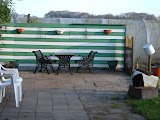 Ons zithoekje is weer een beetje ingericht.In het vorige najaar heb ik de nieuwe schutting geschilderd. De verf heeft de winter goed doorstaan.Ziet er nog goed uit.Zodat ik er dit jaar niets aan hoef te doen. De decoraties zovast eraan gehangen.Planten en bloemen moeten we nog halen.Moeten we nog even wachten op de ijsheiligen.Anders is de kans te groot dat ze bevriezen.